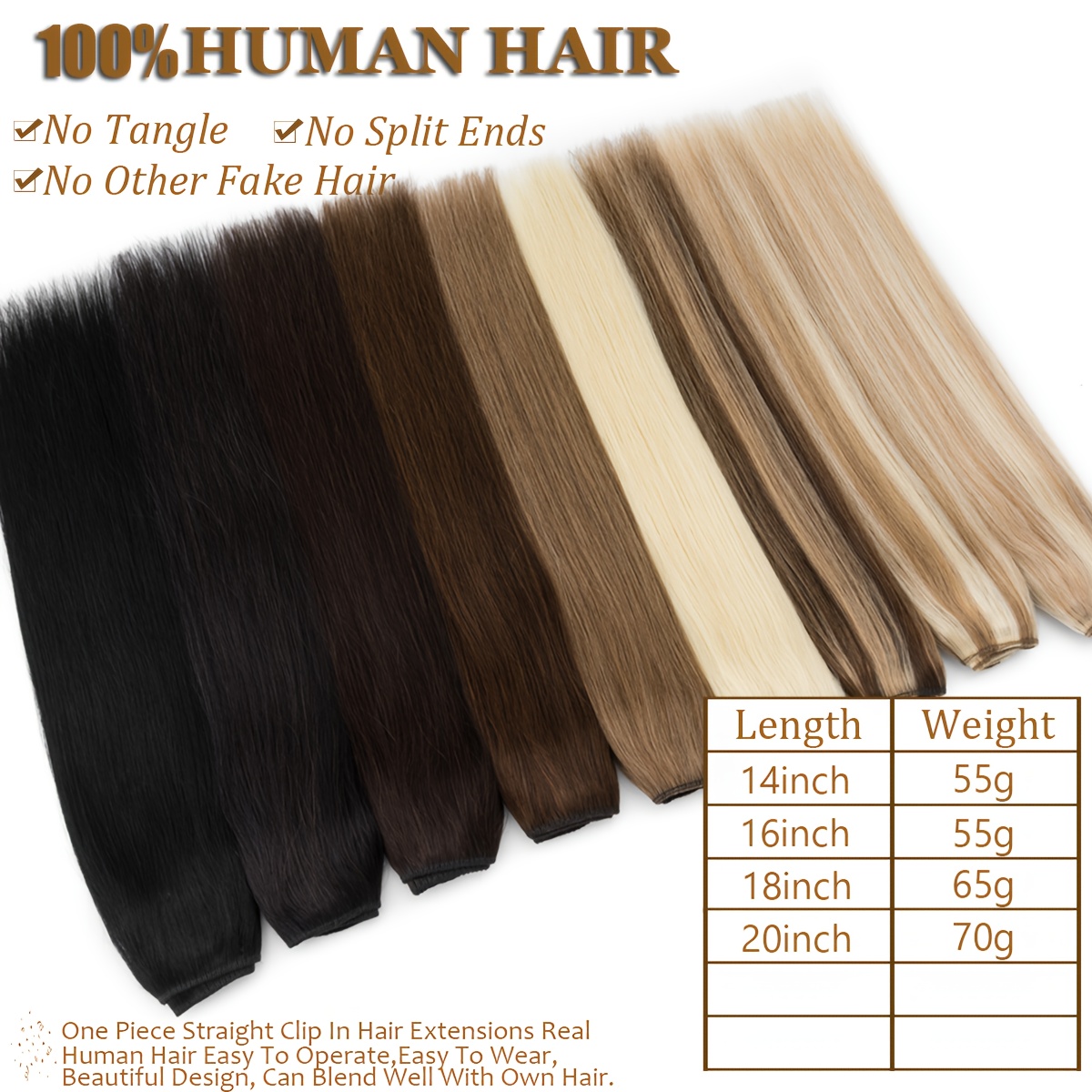 This product is made of 100% Remy human hair extensions with a straight texture. It includes one piece with 5 clips and has a lifespan of 3-12 months, depending on usage and care. The available lengths and weights are: 14’’(35cm) = 55g, 16’’(40cm) = 65g, 18’’(45cm) = 70g, 20’’(50cm) = 70g.