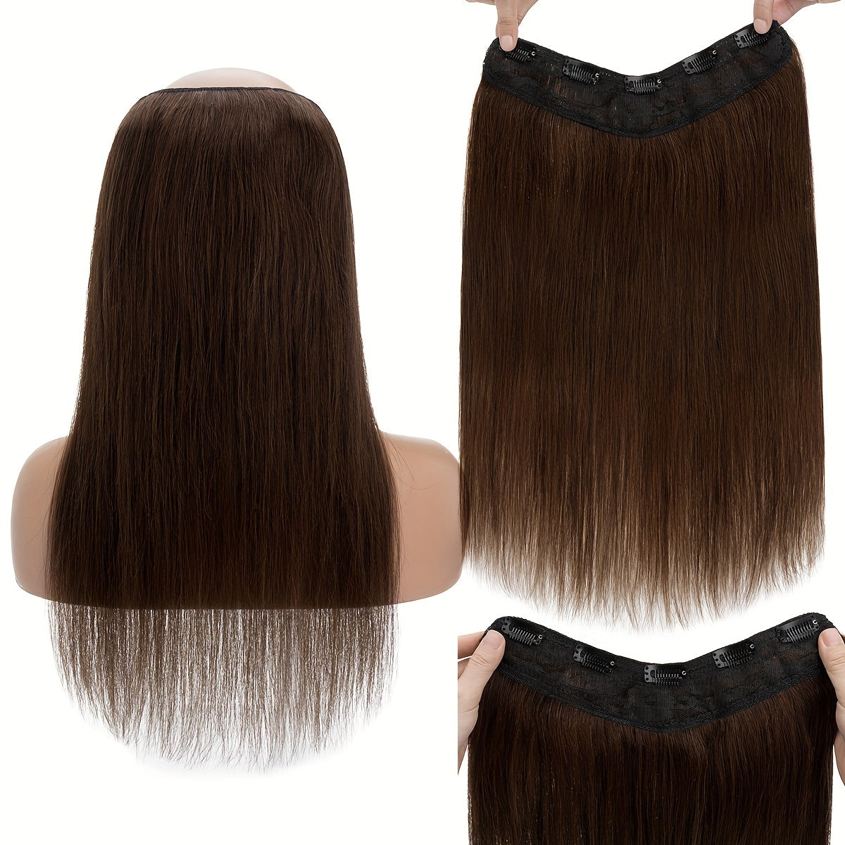 Place the clip hair extensions on your head like a headband, secure them with 5 clips, use only 5 hair clips, suitable for customers with soft and sparse hair on the top of the head. Quick and convenient way to add volume. After teasing your hair, simply clip the hairpiece in place, secure it with a couple of pins, and style it high on your head, low at the nape of your neck, in a bun, or a ponytail.
